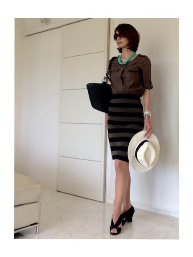 昨日ほどではないけれど、今日も暑い!ので、ロイヤルブルーのスカートをメインにしたコーデにしました。ボートネックでラグランスリーブのストライプTシャツのコットンが心地良いです。